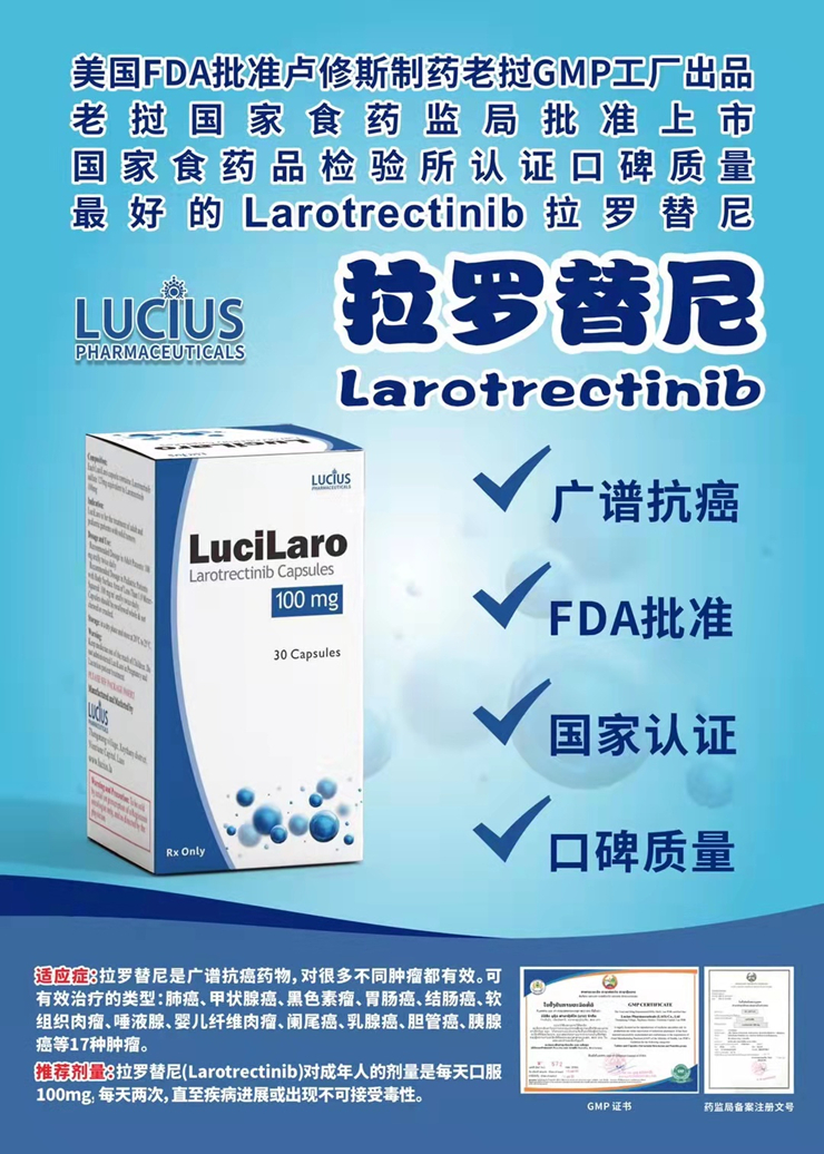 拉罗替尼是一种激酶抑制剂,用于治疗携带NTRK基因融合(NTRK1、NTRK2或者NTRK3基因融合)的实体瘤。拉罗替尼是广谱抗癌药物,对很多不同肿瘤都有效。可有效治疗的类型:肺癌、甲状腺癌、黑色素瘤、胃肠癌、结肠癌、软组织肉瘤、唾液腺、婴儿纤维肉瘤、阑尾癌、乳腺癌、胆管癌、胰腺癌等17种肿瘤。